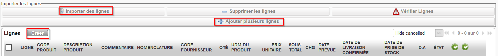 4. Sur l’onglet “Bon de Commande“, cliquez sur le bouton “Créer” situé en haut de la table “Lignes” pour introduire manuellement une ligne de commande. Vous avez aussi la possibilité d’introduire plusieurs lignes en une étape via le bouton “Ajouter plusieurs lignes” ou via import de fichier en cliquant sur le bouton “Importer des lignes“.