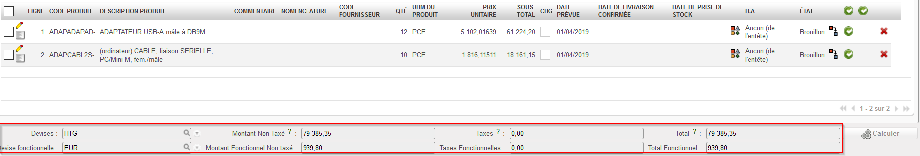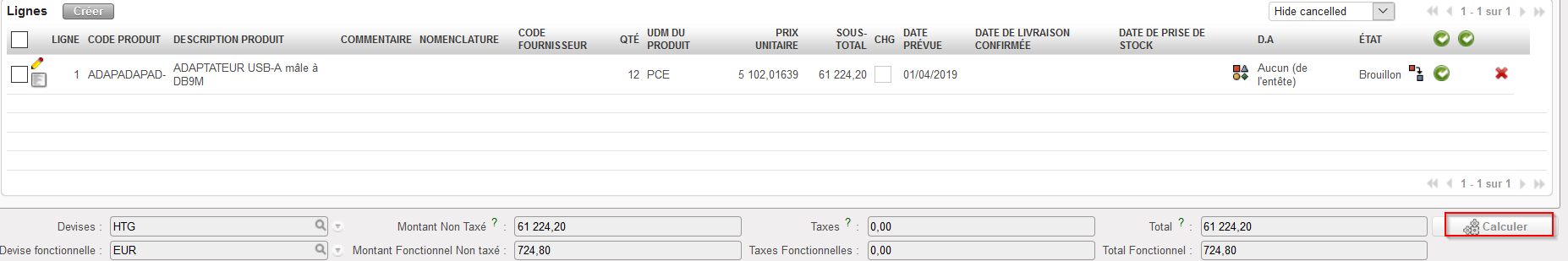 Ligne de commande insérée sur le PO, cliquez sur “Calculer