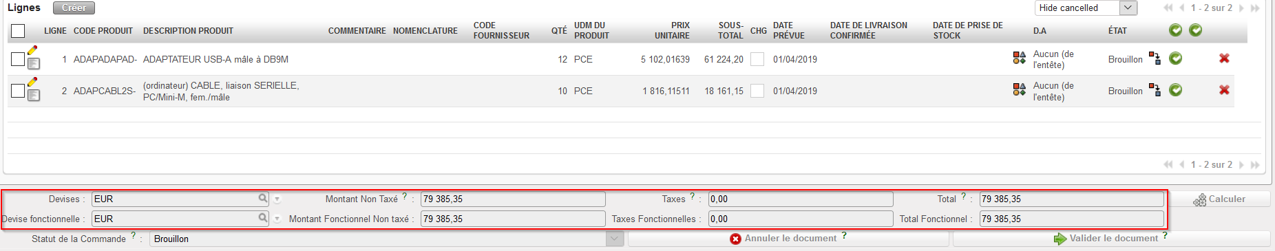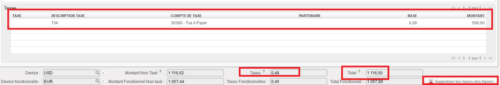 Vous pouvez ajouter/annuler les “Taxes” sur l’ensemble du document ou au niveau de la ligne lorsque le statut de la commande est “Brouillon” ou “Validé“. La suppression des taxes peut être effectuée via le “X” rouge ou pour les taxes au niveau de la ligne via le bouton “Supprimer les taxes sur les lignes“.