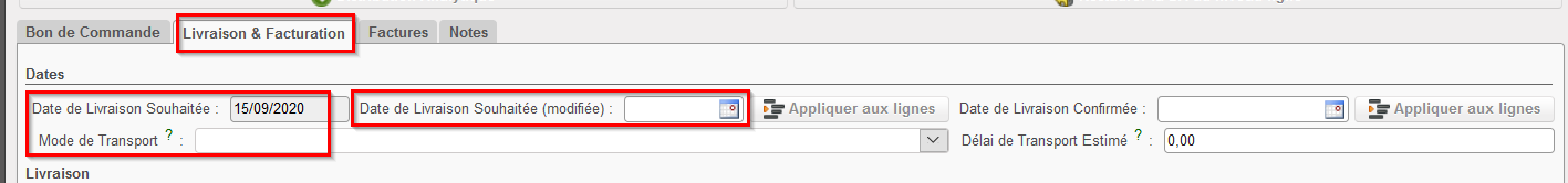Sur l’onglet “Livraison & Facturation“, vous pouvez inclure d’autres informations comme la date de livraison souhaitée ou le mode de transport. Notez que la date de livraison souhaitée peut également être introduite au niveau ligne (dans la fenêtre “Ligne Bon de Commande”) et peut être transférée de l’entête vers toutes les lignes via le bouton “Mise à jour des Lignes“.