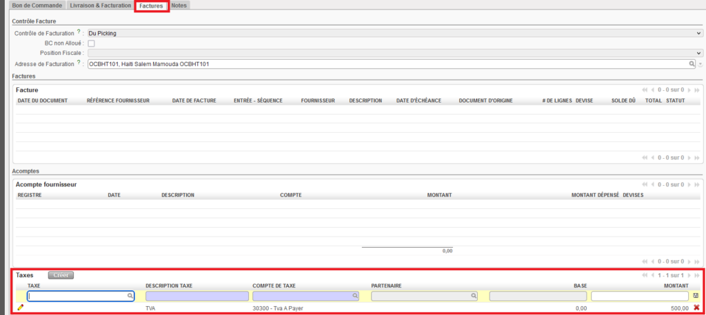 PO – Onglet “Factures” – Section “Taxes”