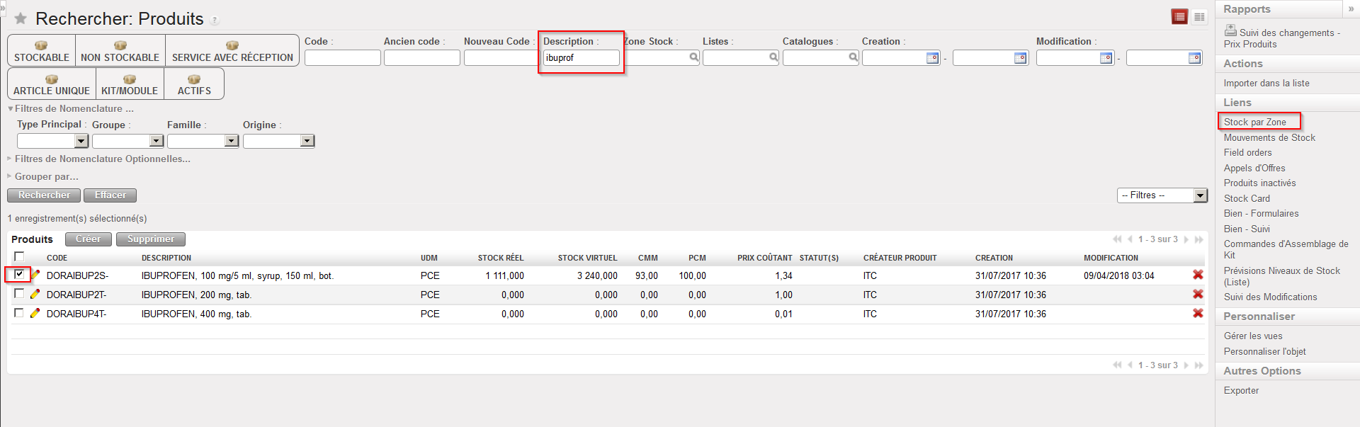1. En utilisant les filtres et une case à cocher, sélectionnez le produit pour lequel vous souhaitez visualiser les niveaux de stock.