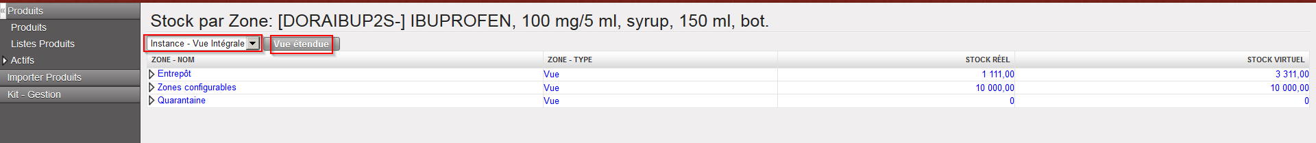 3. L’écran “Stock par Zone” apparait. La vue “Instance – Vue Intégrale” est affichée. Les niveaux de stock réels et virtuels sont affichés. Cliquez sur le bouton “Vue étendue” afin d’afficher toutes les zones de la vue “Instance – Vue Intégrale”.