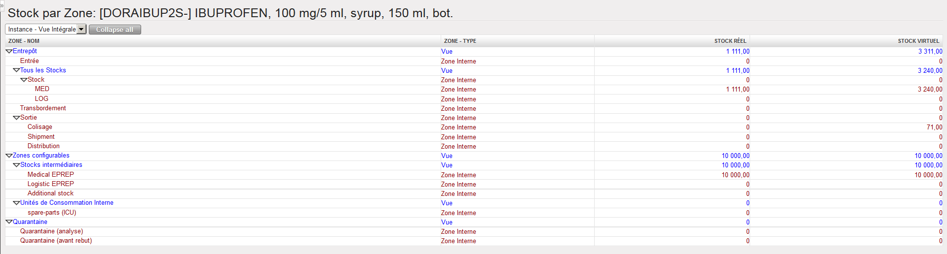 4. La vue “Instance – Vue Intégrale” est éclatée. Toutes les zones appartenant à cette vue apparaissent et les niveaux de stock réels et virtuels dans chacune de ces zones sont affichés.