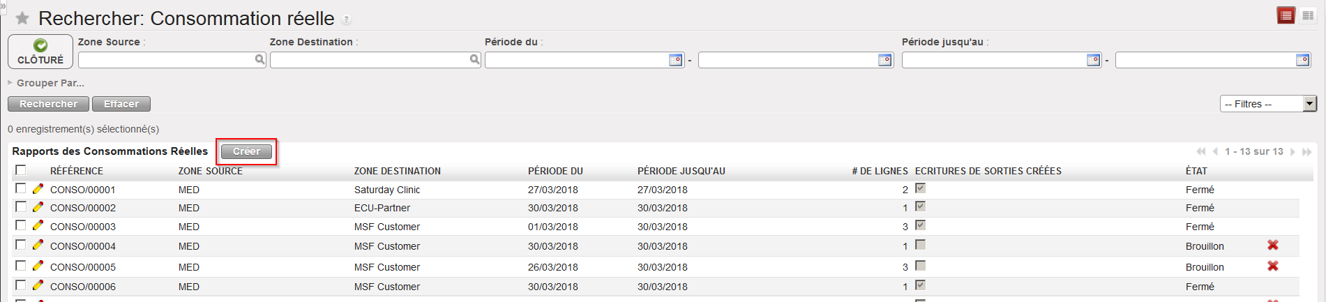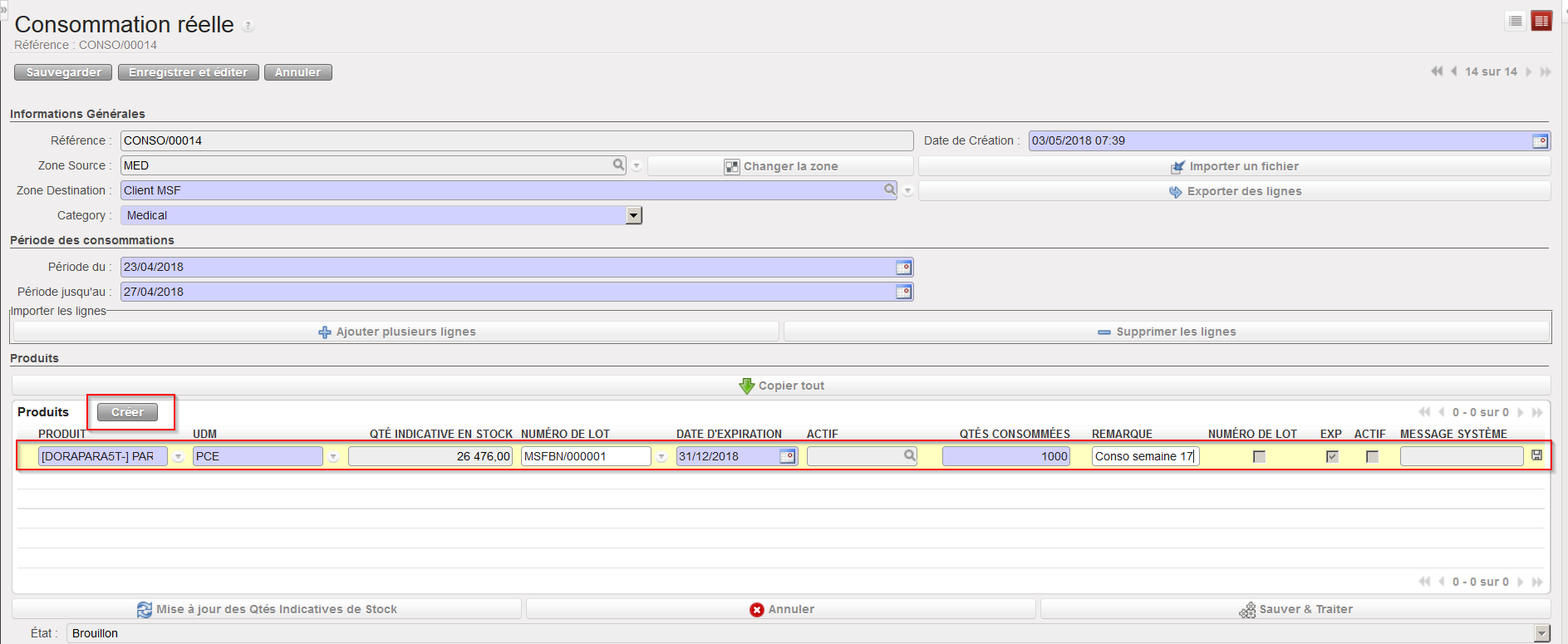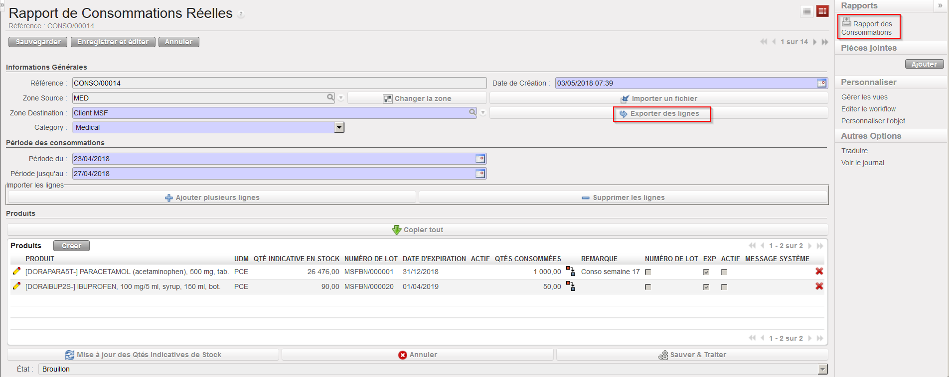 Le rapport est sauvegardé à l’état “Brouillon”. Cela signifie que vous pouvez encore le modifier, l’annuler ou même le supprimer si nécessaire. Une fois traité (i.e. après avoir cliqué sur le bouton “Sauver & Traiter“), le RCR passe à l’état “Clôturé” et les produits sont alors transférés (via un OUT-conso) depuis la zone source vers la zone destination. Il n’est alors plus possible de le modifier.