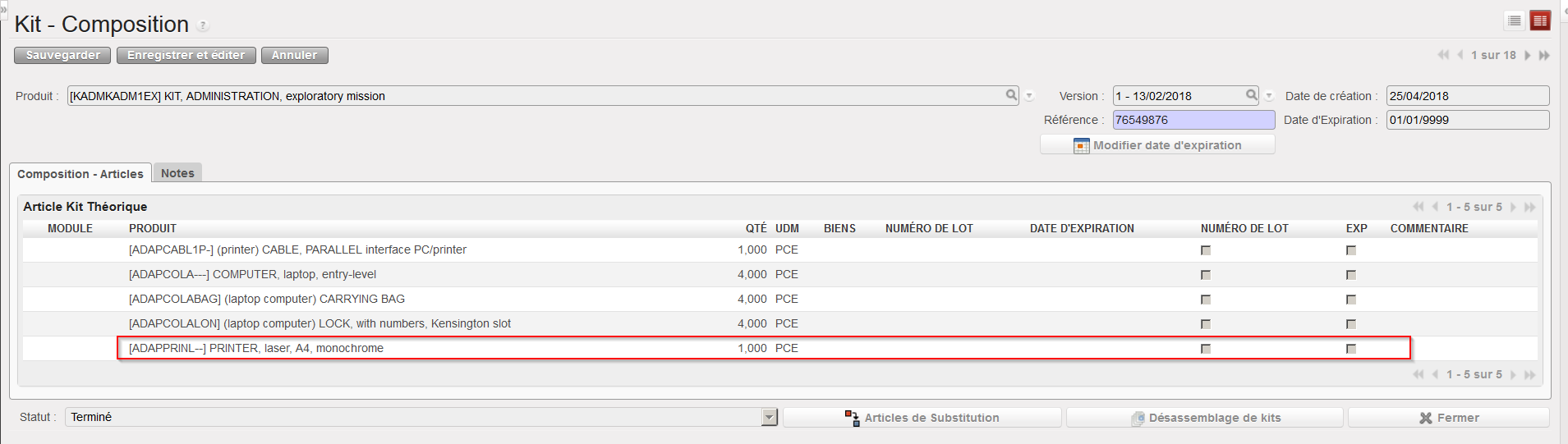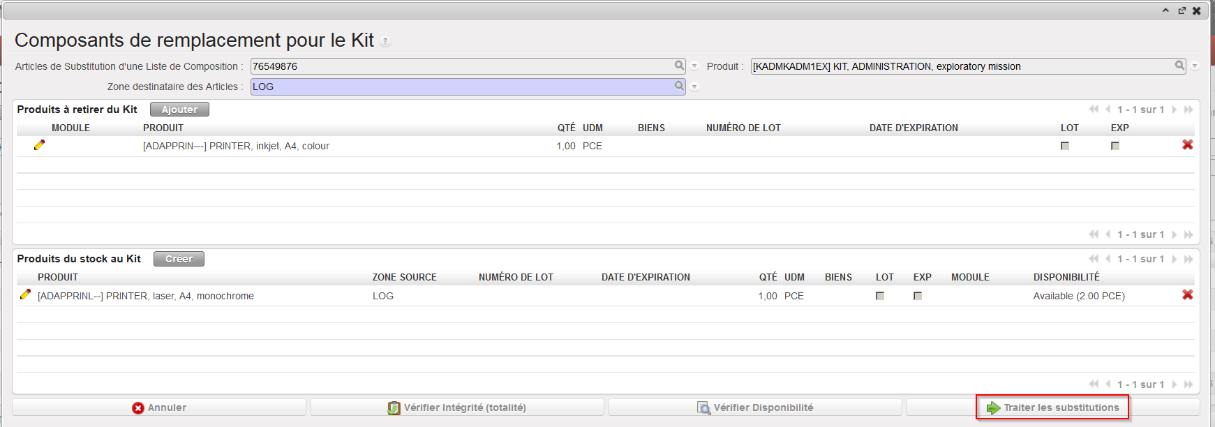 Manuel de l’Utilisateur Supply -> 5. Entrepôt -> 5.11 LU-SU4204 Gestion des Kits -> B. LU-SU4204 Comment substituer les composants d'un kit avec d'autres produits disponibles en stock