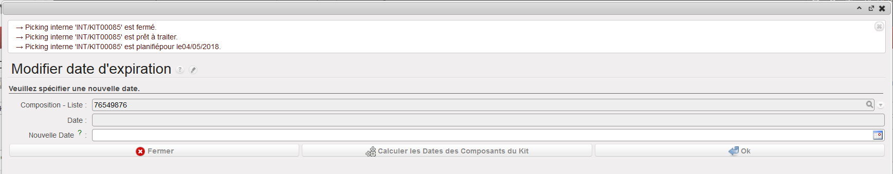 8. Le système vous informe de la création d’un Mouvement Interne (INT/KIT). Ce Mouvement Interne est traité et clôturé afin de transférer les produits du kit vers le stock et du stock vers le kit. Le système requiert la saisie d’une date d’expiration pour le kit dans le champ “Nouvelle Date”. Si le kit n’est pas sujet à péremption, vous pouvez saisir la date 01/01/9999.