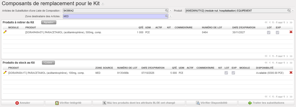 Lorsqu’un kit est en stock, il est parfois nécessaire de retirer un composant de ce kit et de le remplacer par un autre, par exemple lorsqu’un de ses composants est sur le point de périmer. Lors de la substitution d’un composant d’un kit, il faut toujours remplacer le produit retiré afin de ne pas se retrouver avec un kit incomplet.