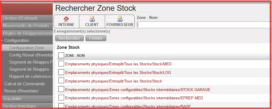 Aller à: Entrepôt /Règles de Réapprovisionnement / Configuration/ Configuration Zone