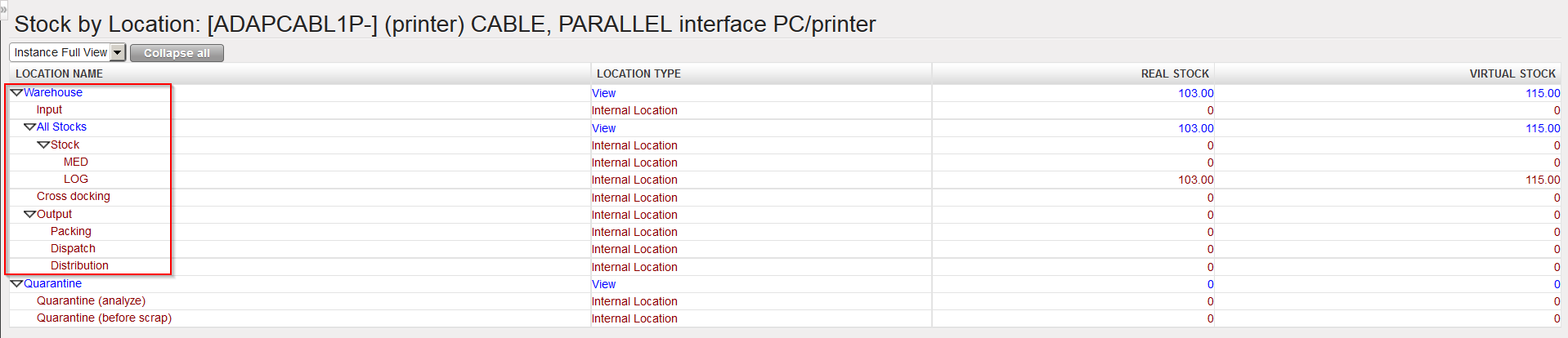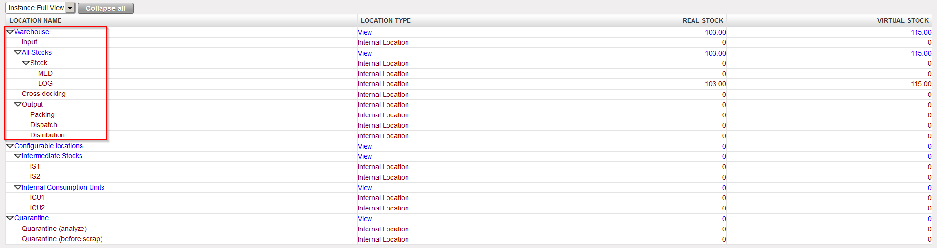 Stock reflects the main stock from a coordination/project. This location has 2 children location, MED for the storage of medical items and LOG for the storage of logistical items. MED products are stored in the MED location. LOG products are stored in the LOG location. LIB products are stored directly in the Stock location (if they are declared as stockable products).