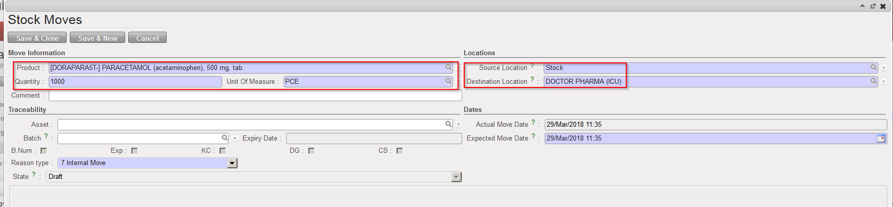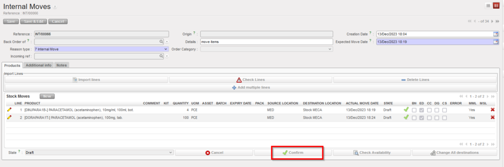 - “MED” / “LOG” or another stock location to transfer the product out of this specific location