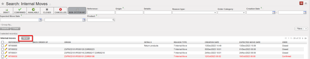- Click on the “New” button to create a new Internal Move.