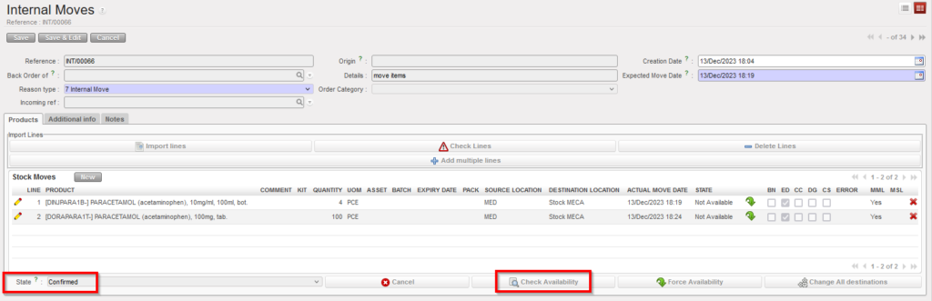| Checking the availability of the products on the Internal Move |