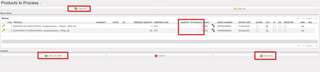 12. On the “Products to Process” screen, click on the “Copy all” button and on the “Process” button.