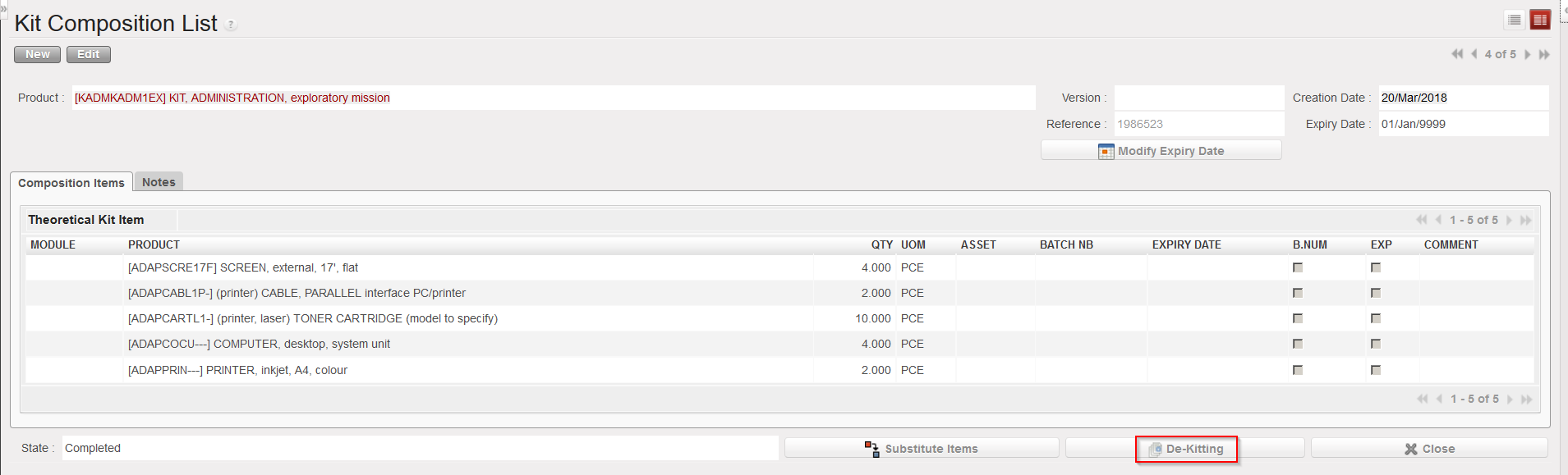 - On the “Kit Composition List” screen, click on the “De-Kitting” button.