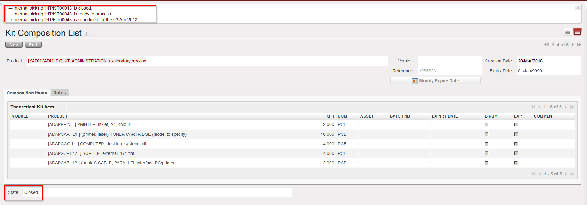 The Kit Composition List switches to “Closed“. An Internal Move with reference INT/KIT is created, processed and closed to move the kit from the stock to the “Kitting” (virtual) location and the kit components from the “Kitting” (virtual) location to the stock.