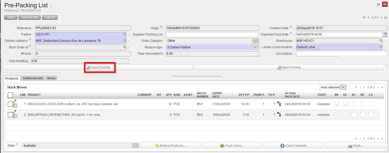 - Click on the “Export Packing” button