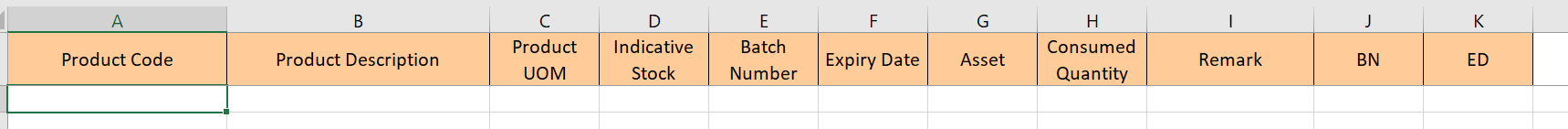 The file must have a specific format (XML Spreadsheet 2003) and include the following columns in the following order: Product Code, Product Description, Product UoM, Indicative Stock, Batch Number, Expiry Date, Asset, Consumed Qty, Remark, BN (Y/N); ED (Y/N).