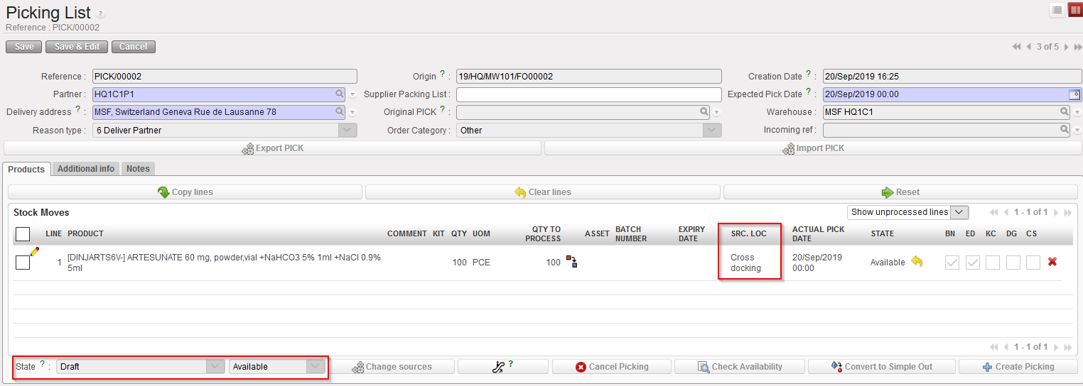 The system creates a Picking Ticket as by default the system considers that the full shipment process (and not the simple out) will be used to deliver the goods to the customer. This Picking Ticket has the state “Draft”. As products are not yet available (they still have to be received in cross docking), the state of the Picking Ticket will be “Not Available“.
