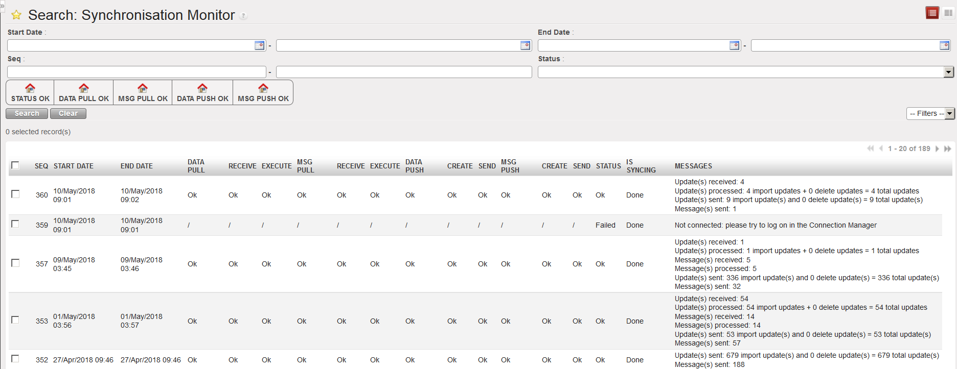You will see the results of the latest synchronizations carried out, ordered from the latest to the earliest. You can also use filters to search for specific synchronization runs.