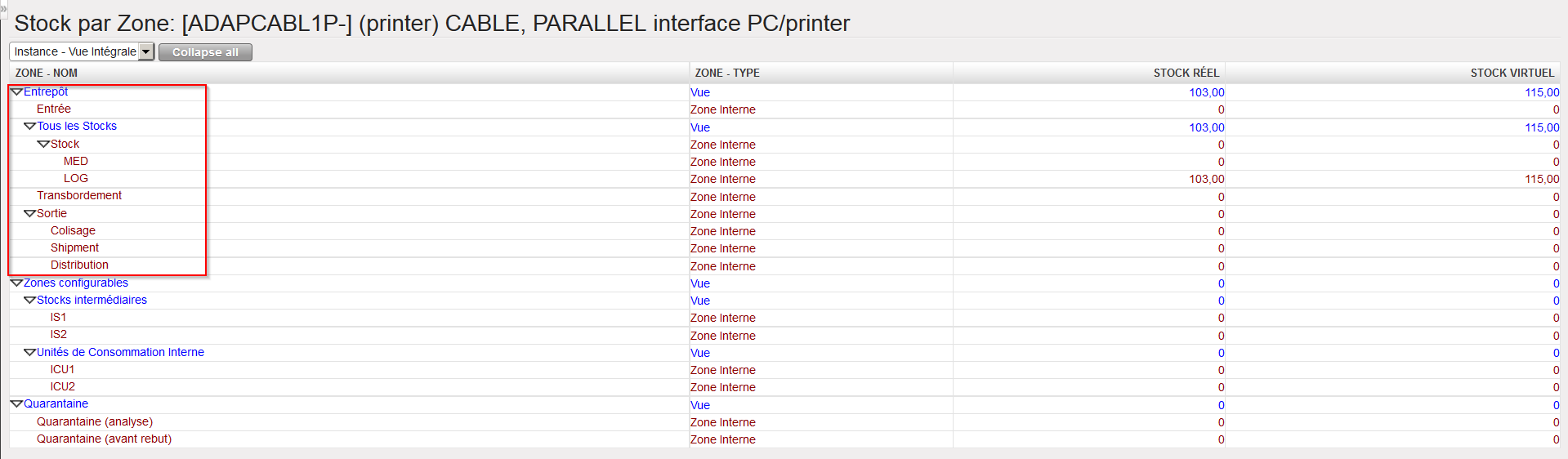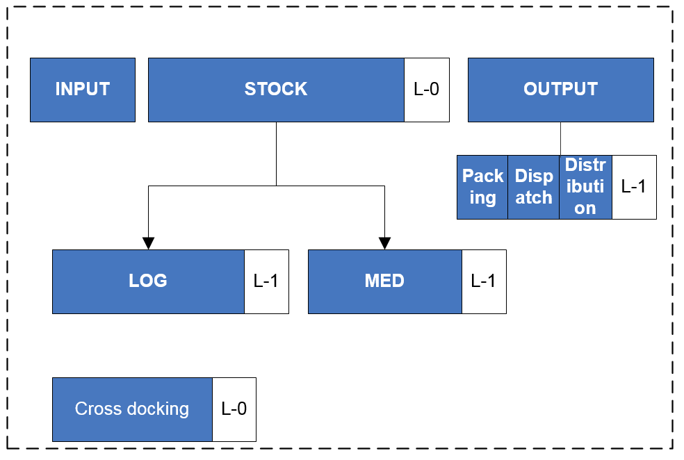 Stock est la zone qui représente le stock principal d’une coordination ou d’un projet. Cette zone a 2 zones enfants, MED pour le stockage des articles médicaux et LOG pour le stockage des articles logistiques. Les produits dont le type principal est LIB sont directement stockés dans la zone Stock (s’ils sont déclarés comme produits stockables).