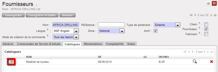 « Modifier le catalogue » en regard de la version/du nom du catalogue que vous souhaitez mettre à jour. L’écran « Catalogue Fournisseur » apparaît alors.