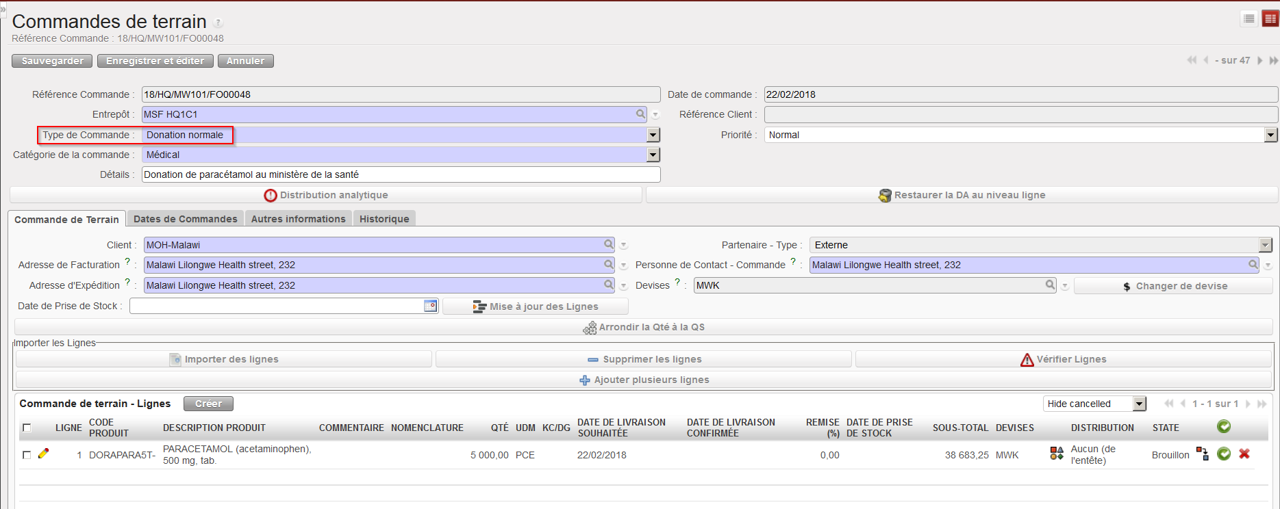 Manuel de l’Utilisateur Supply -> 4. Commandes et Achats -> 4.5 COMMANDES: Commandes de Terrains (Field Orders - FOs) - SpécificitésGénéralités -> C. LU-SU3104 Comment créer une Commande de Terrain (FO) de type Donation normale