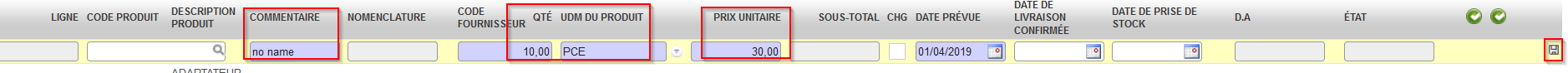 - Entrez un commentaire pour décrire le produit dans le champs « Commentaire », une quantité, une unité de mesure et un prix si vous le connaissez. Notez qu’il ne faut pas remplir le champs « Code produit/ description produit ».