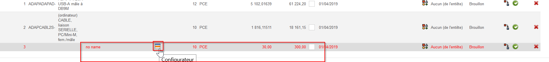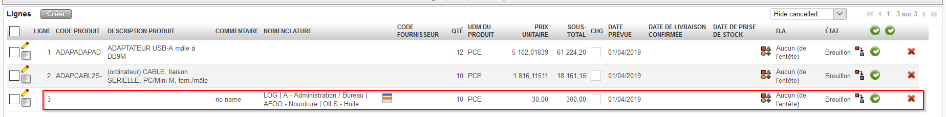 Vous pourrez valider cette ligne de PO par nomenclature mais vous ne pourrez pas la confirmer tant qu’un produit codifié n’est pas introduit dans la ligne (en remplacement de la nomenclature).