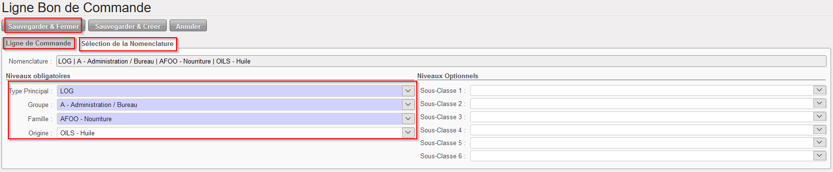 6. A partir de l’onglet « Sélection de la Nomenclature », sélectionnez les niveaux de nomenclature de ce produit : “Type Principal”, “Groupe”, “Famille” et si possible “Origine”. Notez que le commentaire précis peut être deditable dans l’onglet « ligne de Commande ».