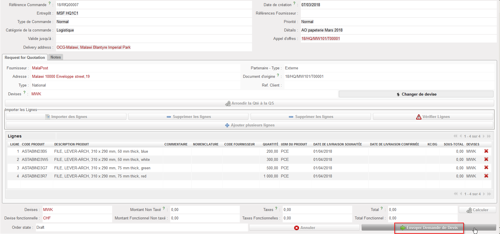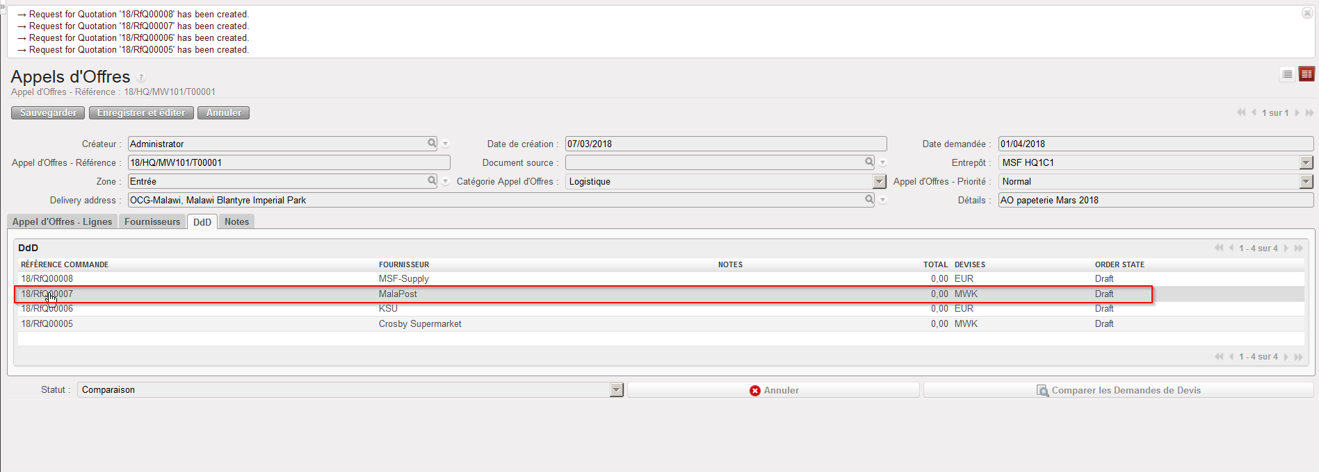 À l’instar des CFT, la plupart des RFQs sont créées automatiquement. On peut les générer en cliquant sur le bouton “Générer des Demandes de Devis” situé au bas de l’écran du CFT Vous obtiendrez autant de RFQs qu’il y a de fournisseurs dans le CFT.