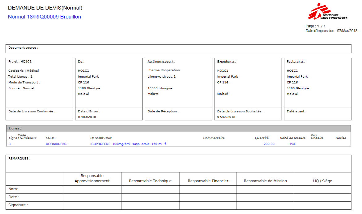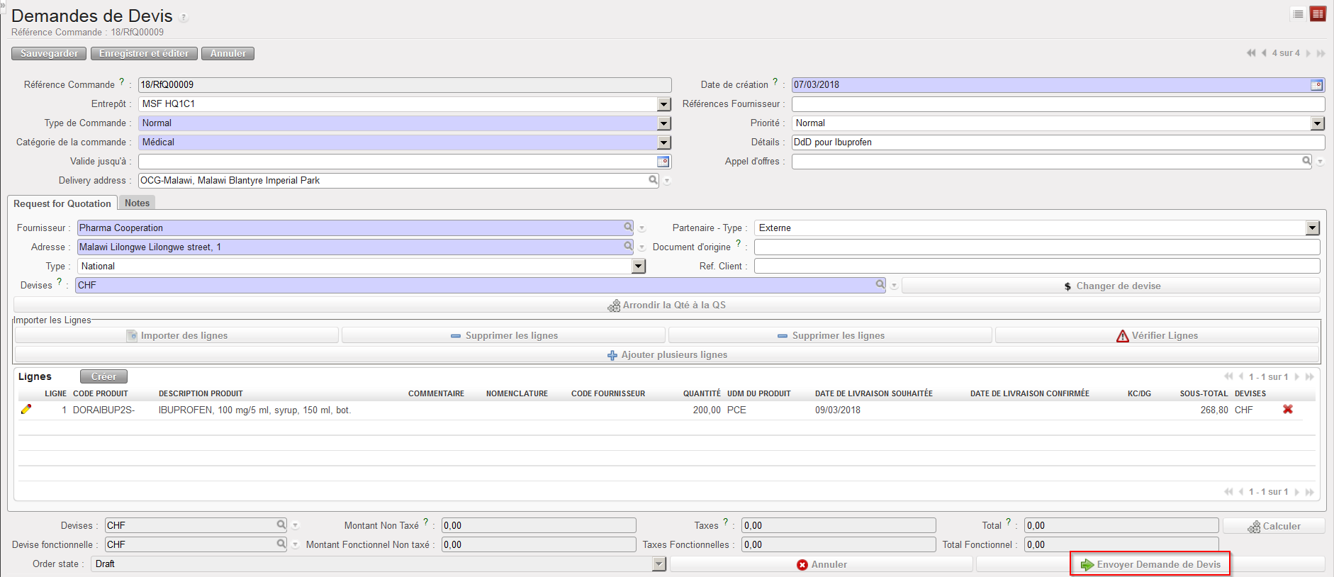 - Cliquez sur l’onglet “DdD” pour visualiser les RFQs créées. Cliquez sur un RFQ pour l’ouvrir. Cliquez sur “Envoyer Demande de Devis” au bas de l’écran pour imprimer la RFQ et l’envoyer au fournisseur. Une version PDF de la RFQ apparait pour impression. En conséquence, le statut de la RFQ passe de “Draft” à “Sent”.