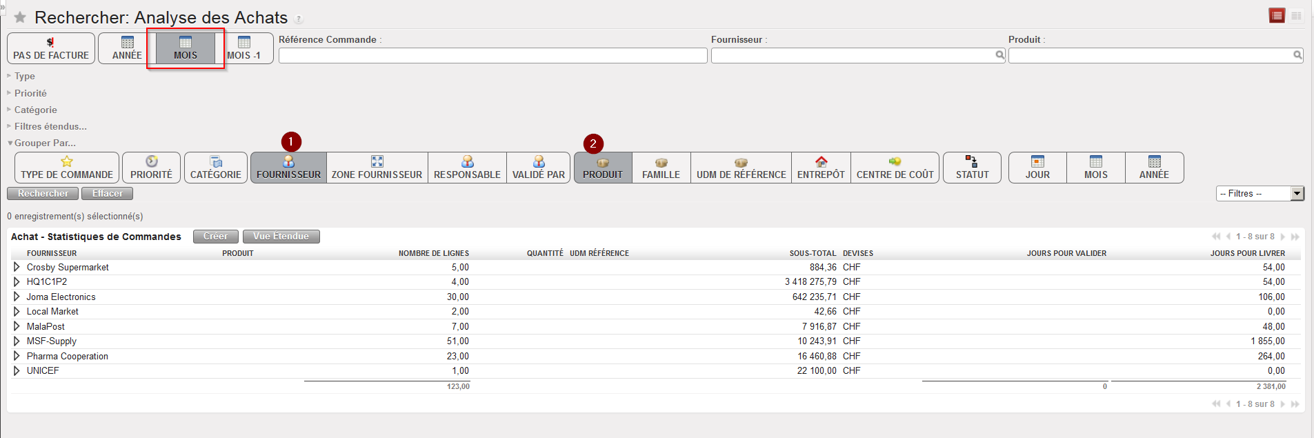 - Par défaut, les POs créés durant le mois courant apparaissent sur l’écran et sont groupés par fournisseur (1) et produit (2). Si vous souhaitez voir le détail par produit, cliquez sur le bouton “Vue Etendue”.