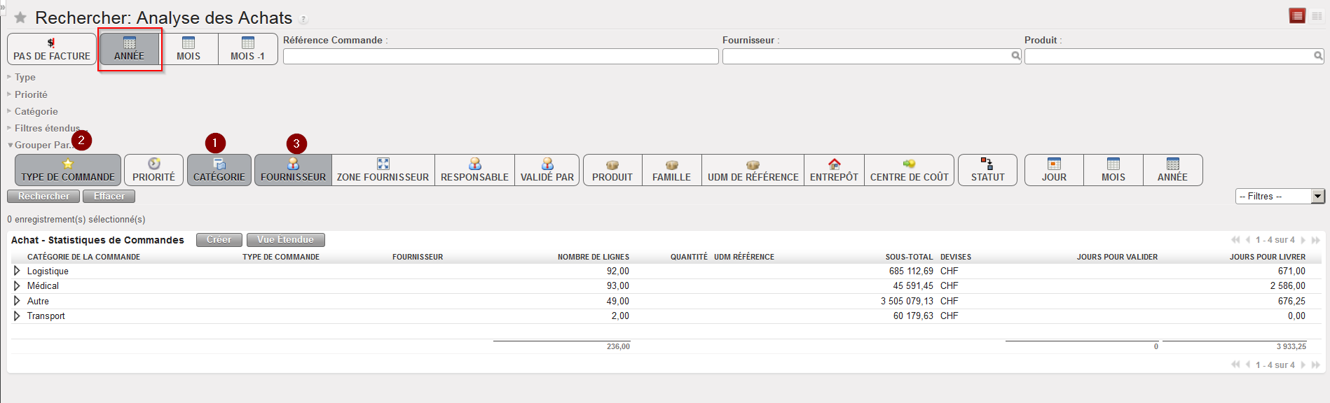 - Utilisez les boutons si vous souhaitez modifier les critères de sélection et/ou la manière dont les données sont groupées (e.g. afficher tous les POs créés cette année et les organiser par catégorie (1), type de commande (2) et fournisseur (3), voir écran ci-dessous).