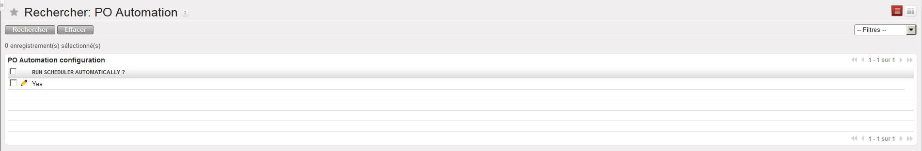 Le “Run scheduler automatically” est mis sur “Yes”, ce qui signifie que les POs seront créés dès qu’une requête (commande ou ligne de commande) sera sourcée sur commande.