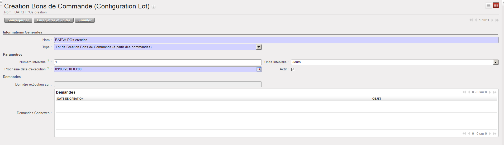 - Cliquer suz le bouton “Créer” pour paramétrer un nouveau batch de création automatique des POs.