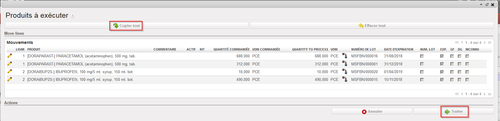 6. Sur l’écran “Produits à Traiter”, cliquez sur le bouton “Copier tout”, puis sur le bouton “Traiter”