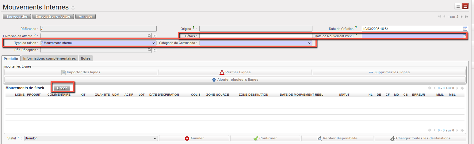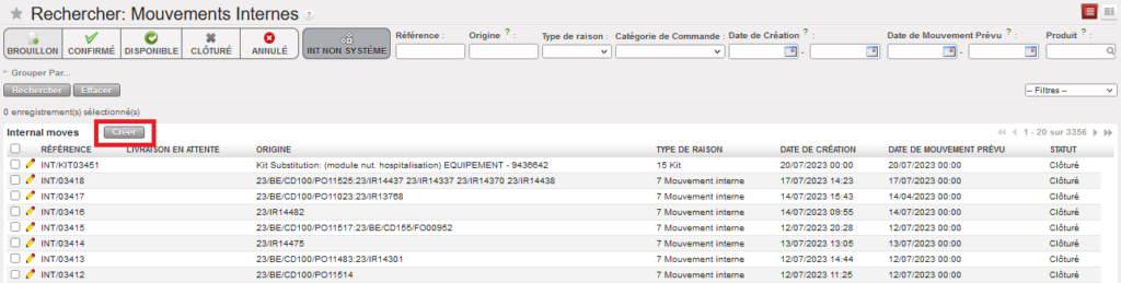 3. Cliquez sur le bouton “Créer” situé en haut du tableau “Mouvements de Stock” pour ajouter des lignes au INT. Notez que des lignes peuvent également être ajoutées via le bouton “Ajouter plusieurs lignes” ou “Importer des lignes”.