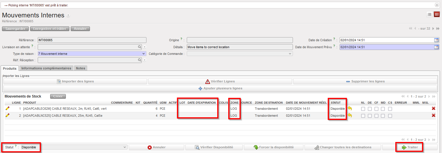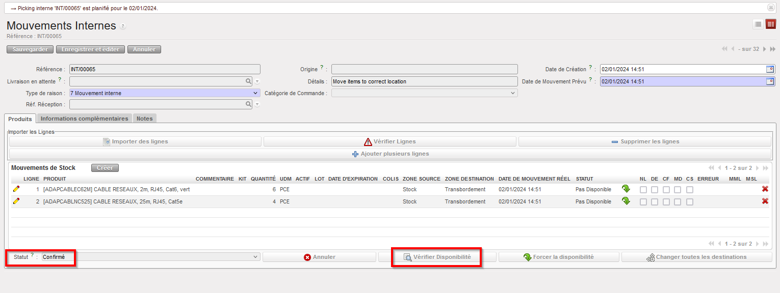 | Vérification de la disponibilité des produits sur un Mouvement Interne |