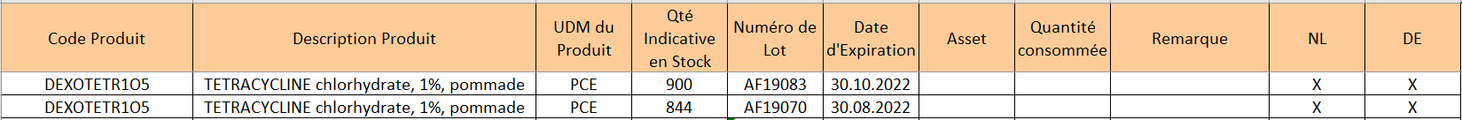 Le fichier doit avoir un format spécifique (XML Spreadsheet 2003) et inclure les colonnes suivantes dans l’ordre suivant: Code Produit, Description Produit, UdM du Produit, Qté Indicative en Stock ;Numéro de Lot, Date d’Expiration, Actifs, Qté Consommée, Remarque, NL (O/N) et DE (O/N).