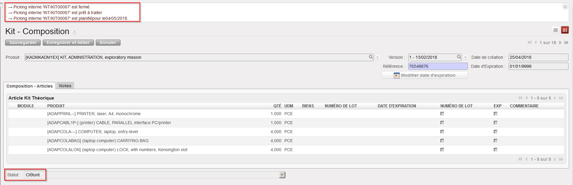 La liste de Composition du Kit passe au statut “Clôturé“. Un Mouvement Interne avec la référence INT/KIT est créé, traité et clôturé pour transférer le kit depuis le stock vers la zone (virtuelle) “Assemblage de Kit” et les composants du kit depuis la zone (virtuelle) “Assemblage de Kit” vers le stock.