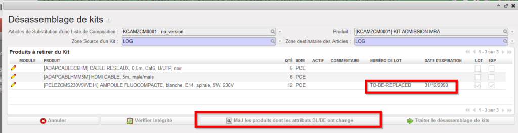 Pour le cas d’un produit composant qui a eu ses attributs de numéro de lot ou date d’expiration changés, il y a le bouton “MàJ les produits dont les attributs BL/DE ont changé” qui va apparaitre dans la fenêtre pop-up. Si vous cliquez sur ce bouton, tout produit affecté auront leurs informations BL/DE enlevées ou auront des infos de défaut pour des BL/EDs ajoutées. Cette action met à jour uniquement les produits affichés sur cette fenêtre de LCK