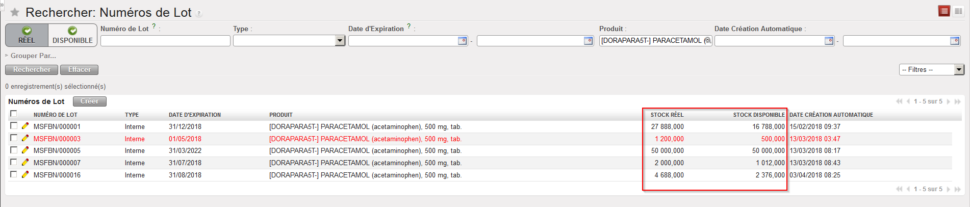 La fonctionnalité “Numéros de Lot”, disponible via Entrepôt / Traçabilité / Numéros de Lot, qui a été introduite plus haut, peut fournir certaines informations sur les niveaux de stock et sur la disponibilité des produits gérés par lot. Elle donne, pour chaque lot, le stock réel et le stock disponible sur l’instance.