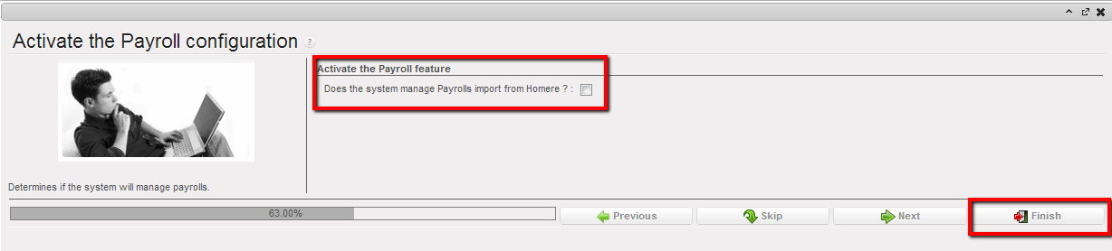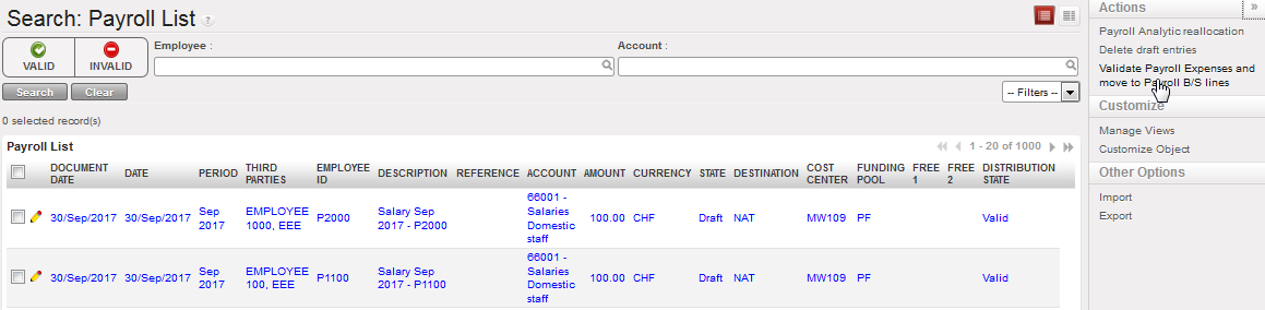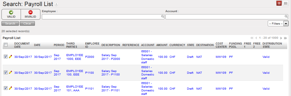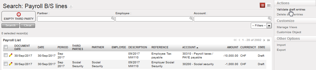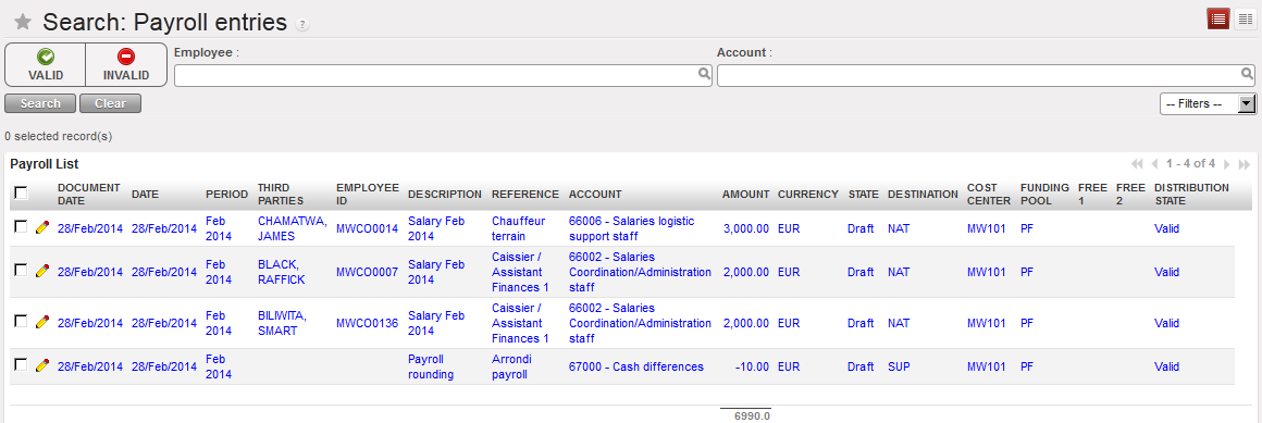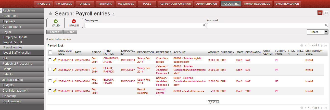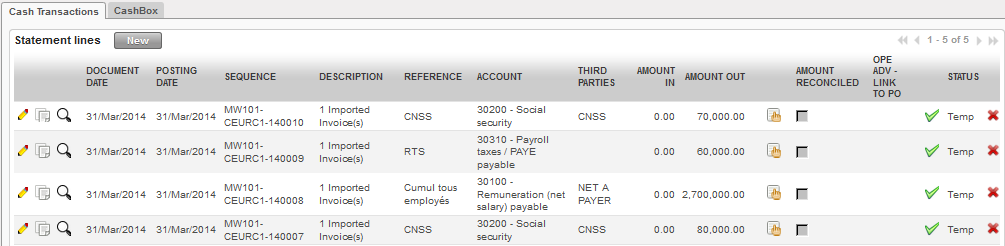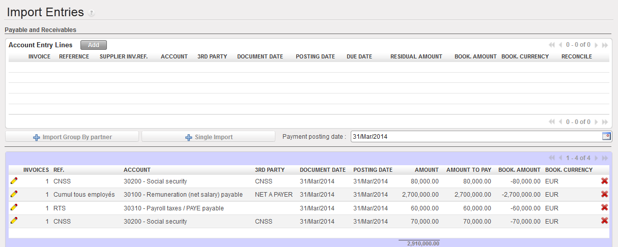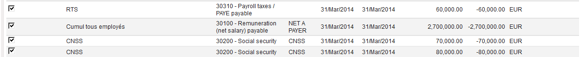 If you made any mid-month salary advance payments, you should have recognized money that was paid from your liquidity account by manually creating an entry in the register (1 register entry could consolidate the payment of salary advances for several employees). Regarding the payable entries remaining to pay at the time of importing the payroll (e.g.: net to pay salary dispersed at the end of the month, social contributions, taxes, etc.), UniField allows you to import these expenses into your registers.