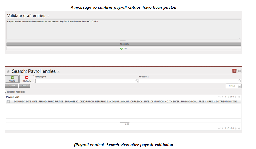 The validation of payroll entries recognizes expenses and payable amounts. Mid month salary advances have already been paid via the registers. The end of month net to pay salary amount is still to pay and has not physically impacted your cash or bank balance until you record the payment directly in your registers.