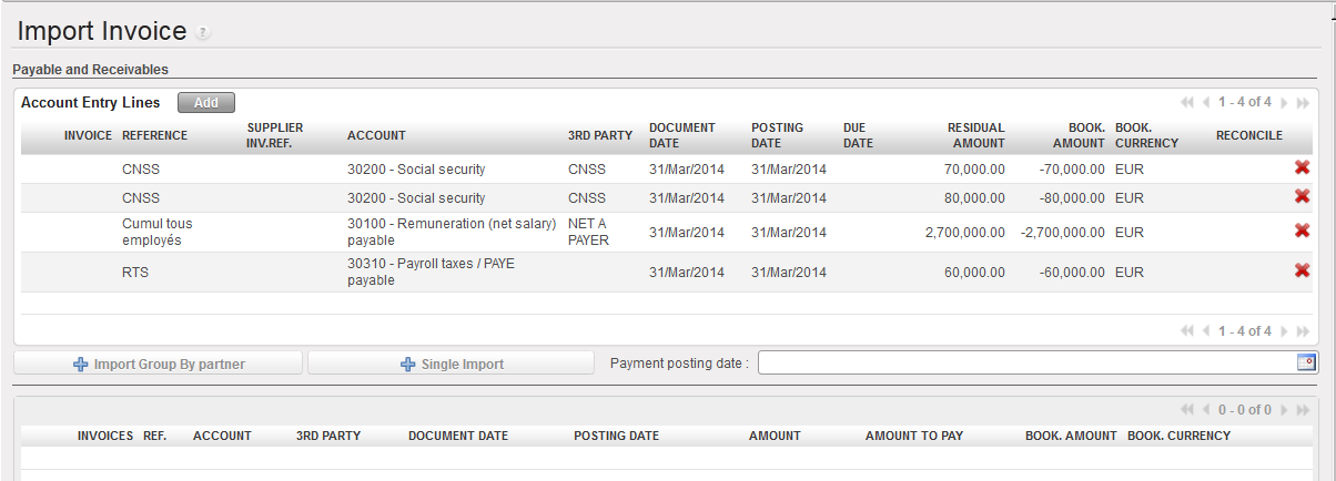 - Back to the import invoice window, input a payment {Posting date} and select {Single import} if you want the entries to remain separate payments. Select {Import group by partner} if you would like to make one payment for different entries for the same partner.