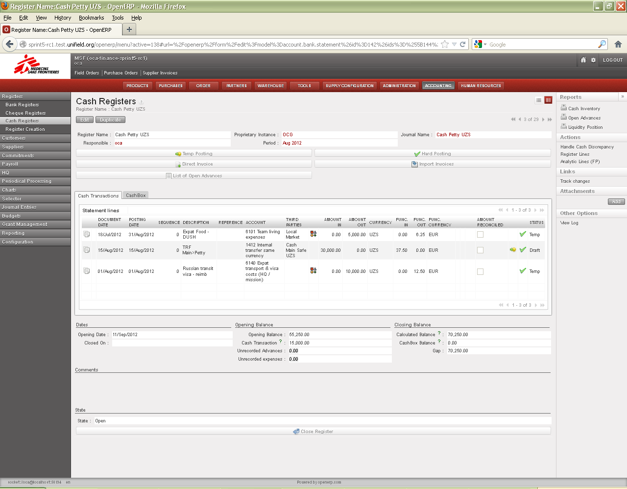 In addition to direct entries, direct invoices and supplier invoice payments, UniField is designed to handle all specific payments types required by MSF operations.