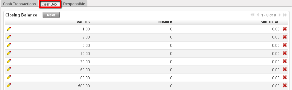 Three (3) tabs are located on the middle of the form. They are called the {Cash transactions}, the {CashBox} and the {Responsible}.