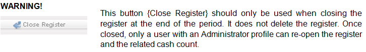 WARNING! This button {Close Register} should only be used when closing the register at the end of the period. It does not delete the register. Once closed, only a user with an Administrator profile can re-open the register and the related cash count.