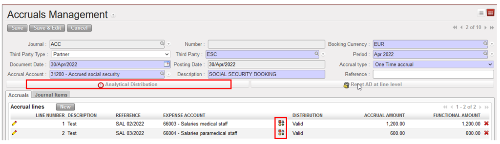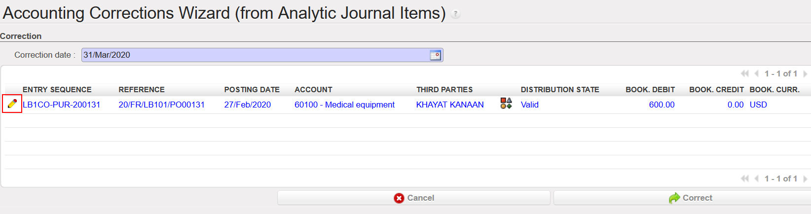 OD: Analytic Journal Items => perform a correction in one line to change the accounting code by clicking in the envelope => Validate => The reversal and the correction will be booked in OD Journal.